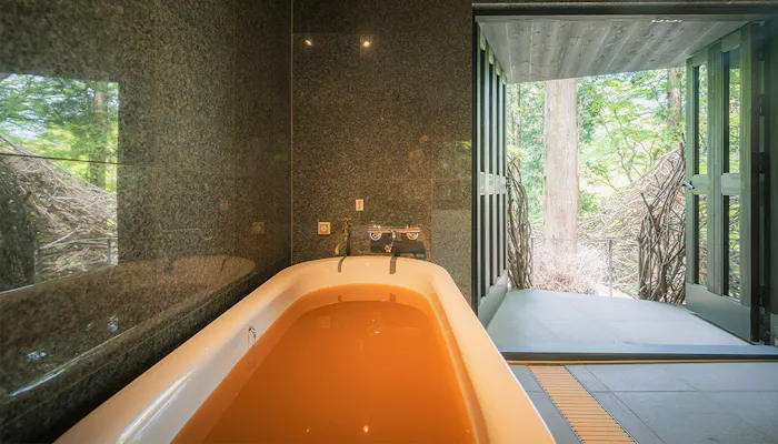 さらに2022年5月には、宿で初めての露天風呂付客室となる「ツリーハウス温泉露天・低温サウナ付ヴィラ コルボ・デ・オウロ」が誕生。居室部分は、天井の高い約100平米の平屋造り。内風呂の扉を開けると、その先は鳥の巣を思わせるツリーハウスになっており、有馬の名湯・金泉に満たされた露天風呂が現れます。世界初のツリーハウス型温泉で、有馬の恵みにたっぷりと癒されて。