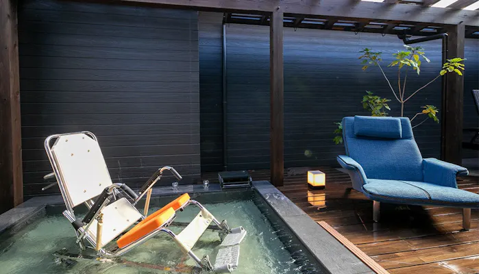 客室は全13室で、2022年5月~7月に誕生した「月の光の路地裏」エリアには、2棟の平屋タイプと、2棟のメゾネットタイプの離れ客室が。その中でも最も広い「【スイート/風月庵/メゾネット】」は、広さ約83平米。テラスには3つの湯船に分かれた岩露天風呂が備わる贅沢な造りです。「【スイート優月庵/メゾネット】」「【スイート彩月庵/平屋】」の露天風呂には、湯船の底が上下して高さが変動する、九州初となる可動式浴槽を採用しています。