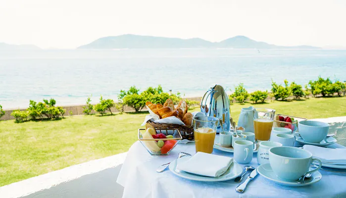 お部屋から海を楽しんだら、屋島の緑に包まれたレストランでこだわりのフレンチを。シェフが毎朝仕入れる魚介や瀬戸内の食材を使用した、南フランス風の体に優しいお料理は、自然派ワインとの相性も抜群です。朝食は、自家製パンに無農薬の果物で作られた自家製ジャム、香川県産はちみつなど、フランス流シンプルスタイルで、優雅な朝を迎えましょう。