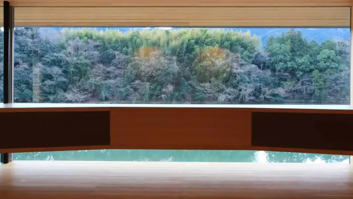 2方向の壁を全面ガラス張りにしたリビングのなんという開放感!「奥湯河原 結唯 -YUI-」の「離れ紫葉「紫夕」最上級グレードと155平米の広さの一棟貸し」のリビングは、奥湯河原の緑と一体になれるリビング。BGMは瀬音。藤木川に突き出したように設けられた露天風呂では、まるで川に浮かんでいるようなスペシャルな入浴が叶います。