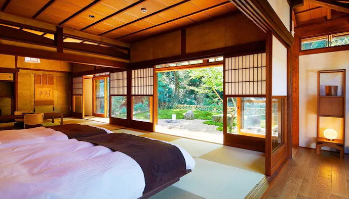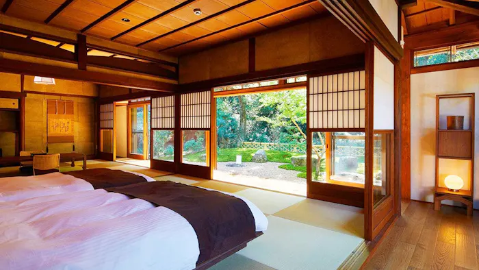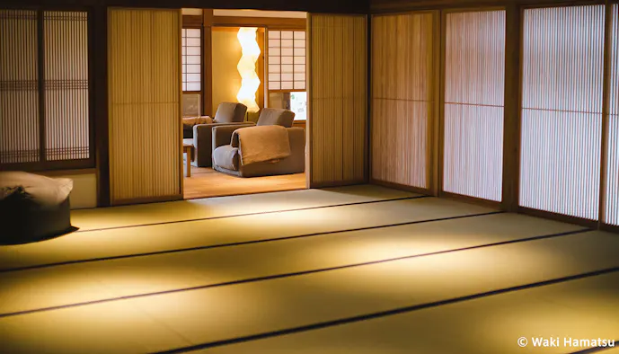 2019年にリニューアルされた歴史あるお屋敷の客室は、威風堂々としながら静けさが心地よい佇まい。「瞑想ルーム」と名付けられた23畳の大広間で、お茶の香りに包まれながら坐禅や瞑想するのも素敵な時間。緑茶には、心が落ち着く成分が複数含まれていることは科学的にも明らか。普段よりも深く心を鎮められるのではないでしょうか。