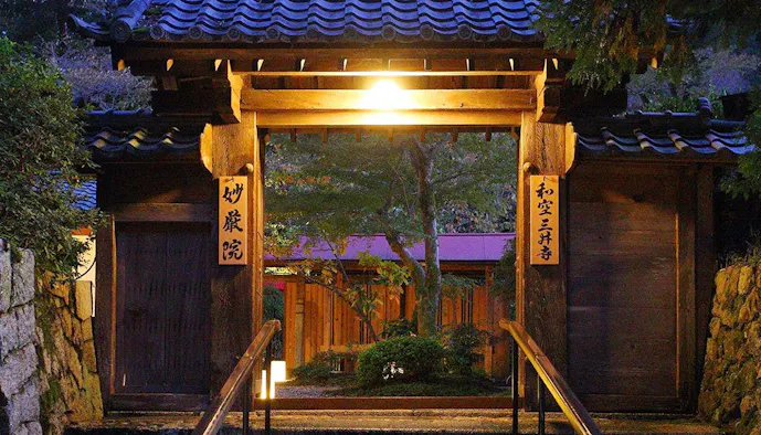 琵琶湖の南西、広大な敷地を有す三井寺(園城寺)は、天智天皇ゆかりの1300年余の歴史を重ねてきた古刹。4つの国宝建築物と64点の国宝をはじめ、多くの歴史的、文化的な至宝を抱く境内に、400年以上佇む一棟貸しの宿坊「和空三井寺」。端正な和の設えと、石と苔が魅せる美しい庭に心和むでしょう。