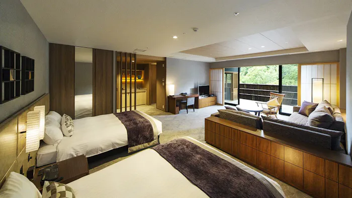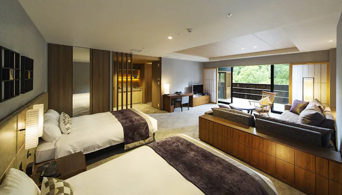 金閣寺(鹿苑寺)からほど近い「しょうざんリゾート京都」の敷地内に立つ「ホテルハーヴェスト京都鷹峯」。鷹峯三山を借景に、約3万5,000坪の庭園を整備した美しい環境に抱かれる客室は、非日常感を満喫できるでしょう。