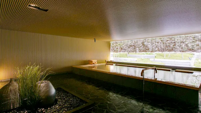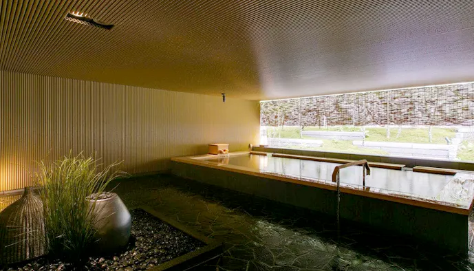 リゾートの敷地内に湧き出した天然温泉は、優しい肌あたりの“美肌の湯”。露天風呂付大浴場「明(あかり)の湯」は、「地‐Kuni‐」「宙‐Sora‐」の二種類の趣異なる風呂を日替わりで楽しめます。「宙」の反響する音を利用した独特の安らぎが得られる「瞑想風呂」は施設の自慢。ジャグジーやサウナも備わり、身も心も“ととのいそう”ですね。