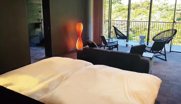 宿のコンセプトは“自然との共存”。全客室にテラスを設置するなど、すべての空間が「雲仙国立公園」の自然に面しているため、四季折々の景色を眺めながら寛ぐことができます。最上階のスイートルーム「【半露天風呂・テラス付】プレミアムデザインスイート」は、源泉掛け流しの半露天風呂付。大浴場にも雲仙の名湯が注がれる露天風呂と内風呂に加えて、サウナまで完備。こだわり抜いたデザインの空間と、効能豊かな温泉に癒されてみてはいかがでしょう。