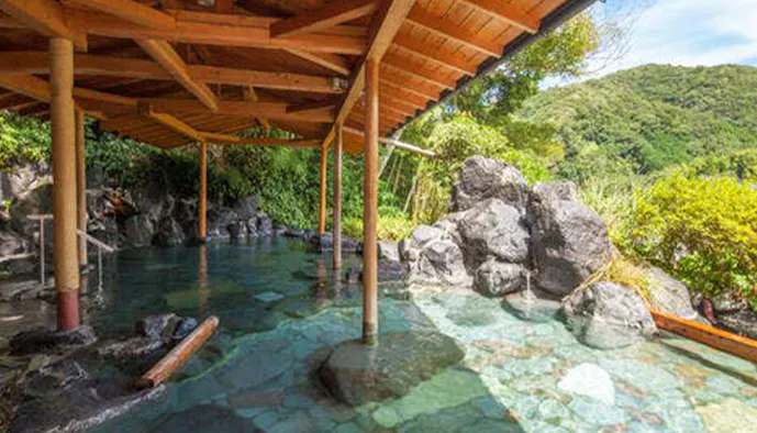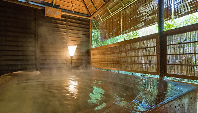 野趣あふれる露天風呂が2つ、数寄屋造りの脱衣場を備えた内風呂や緑豊かな景色を見渡す大浴場のほか、設えの異なる貸切風呂が3つに、岩盤浴まで!とても1日では入りきれないほど豊富な湯処を持つ「嵯峨沢館」。すべての湯処がアルカリ性単純泉の自家源泉掛け流しで、館内で湯めぐりできるのが魅力です。