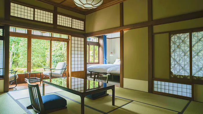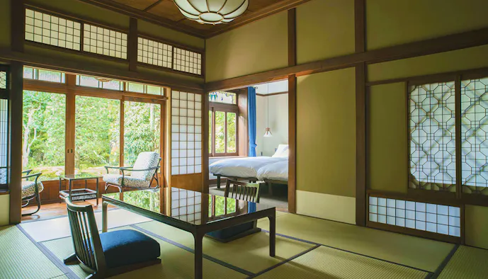 建築好きのご夫婦におすすめしたい、修善寺温泉の「柳生の庄」。お部屋の間取りはさまざまですが、本数寄の風情や庭と竹林の趣きが、日本情緒に浸ってのんびりしたい人にぴったり。客室ごとに趣が異なる湯船で美肌の湯を味わうひと時は、格別のリラックスタイムとなるでしょう。