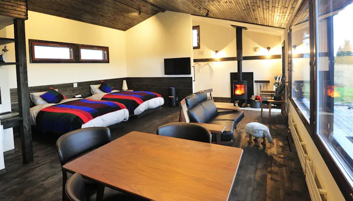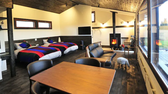 木の温もりを感じる平屋の建物内には薪ストーブを完備。揺らめく炎やパチパチと薪が爆ぜる音は、不思議と心をリラックスさせてくれることでしょう。昼の景色だけでなく、夜空に煌めく数えきれないほどの星も見ものです。大自然に溶け込むような滞在を叶えてみては。