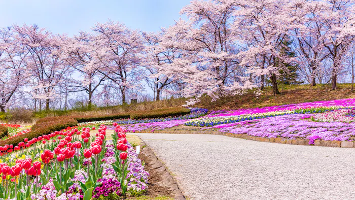 宮城県・釜房湖のほとりに位置する「国営みちのく杜の湖畔公園」は、様々な遊具やキャンプ場などを備えた東北随一の国営公園。園内では趣の異なる6つのエリアで、季節ごとの草花を楽しめます。なかでも「彩のひろば」にある大花壇は、美しく整えられた花々が季節の訪れを感じさせてくれます。
