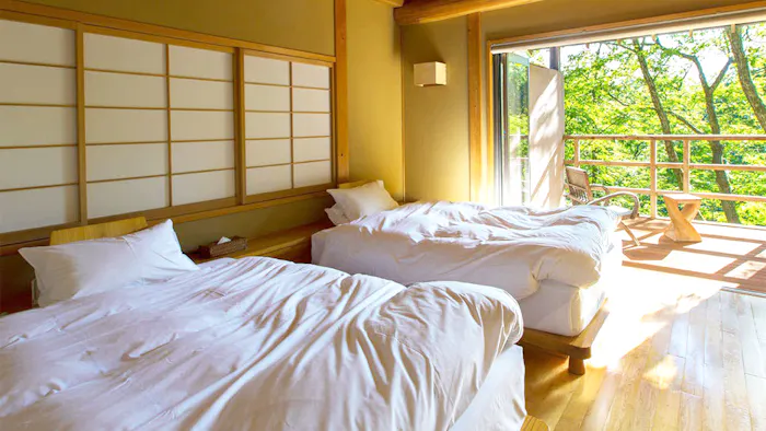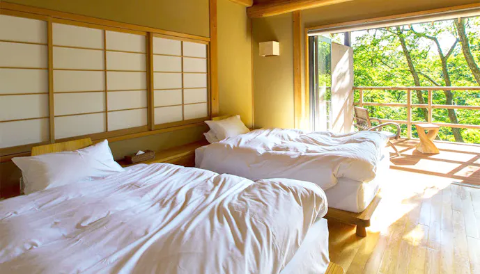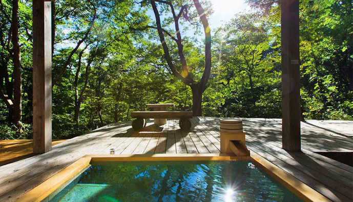 客室は敷地内の5つのエリアに12棟、全18室をご用意。それぞれテーマや設えが異なるものの、どの部屋も屋根までの吹き抜けで開放感たっぷり。自然に溶け込むように穏やかなひとときを過ごせる、大人のための温泉宿です。
