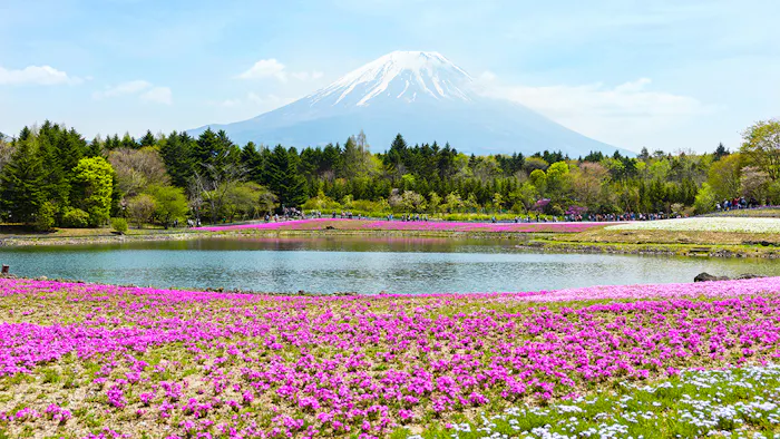 「富士本栖湖リゾート」は、本栖湖から車で5分ほどの場所にある人気の観光スポット。毎年春に開催される「富士芝桜まつり」が有名で、あたり一面を埋め尽くす鮮やかなシバザクラと、雄大な富士山の景色を一度に満喫できるのは、ここならではと言えるでしょう。