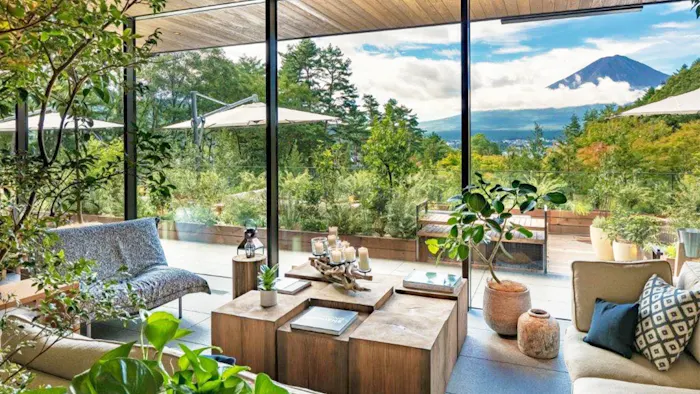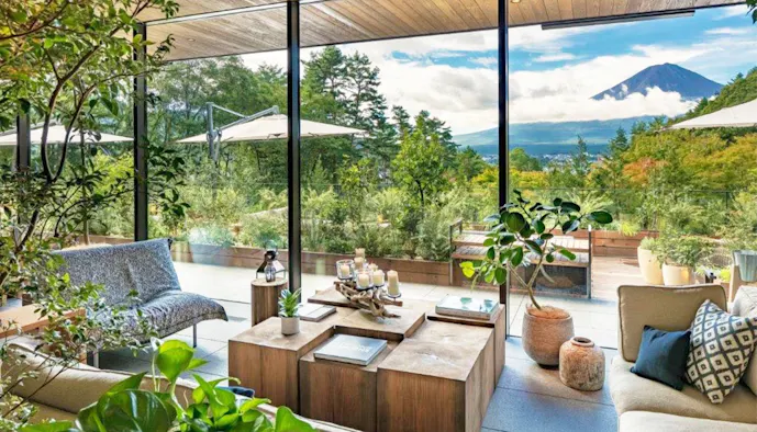 6タイプある客室は、すべて富士山を望むスイート仕様。季節ごとに変わる富士山の姿を愛でながら寛ぐことができます。室内には天然温泉を湛えた専用風呂や、環境に配慮したバイオエタノール暖炉を完備。森の薫りに包まれて、心安らぐ休日を過ごしてみては。