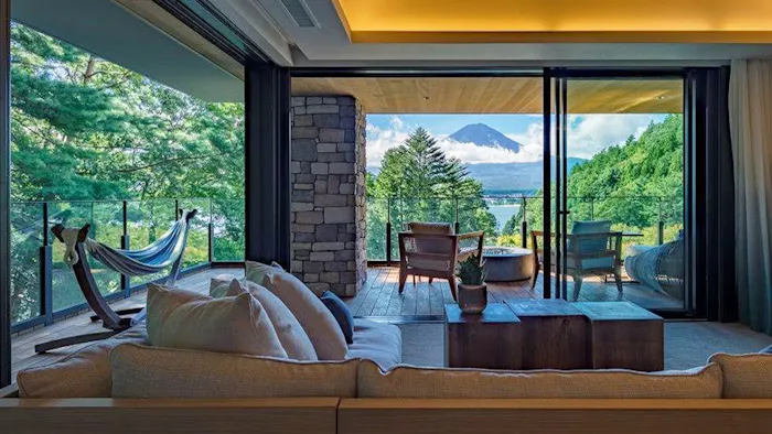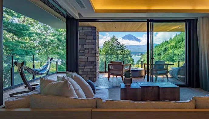「ふふ 河口湖」は、富士山と河口湖の景色を満喫できる森のリゾートホテル。ロビーラウンジやバー、ファイヤーピット付のテラスなど、館内の至るところに木の質感を活かしたインテリアが配され、温もりのある空間を演出しています。