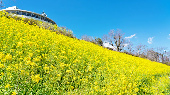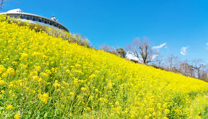 房総半島の山々や東京湾、富士山などの雄大な景色を見渡す鹿野山にある「マザー牧場」。“花と動物たちのエンターテイメントファーム”として、様々な動物と触れ合えることはもちろん、花の鑑賞スポットとしても広く知られています。春の菜の花、初夏のネモフィラなどが丘を染め上げる様子は圧巻です。