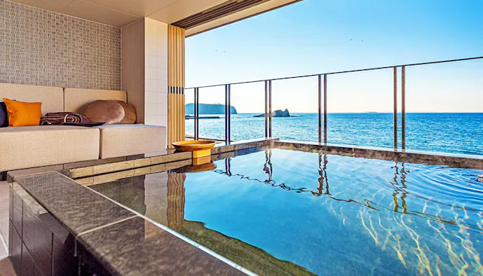 房総半島の南西部に位置する「さざね」は、全12室、5タイプの露天風呂付オーシャンビュー客室を備えたラグジュアリーな温泉宿。宿泊を12歳以上に限定している大人のための隠れ家です。天候が良ければ、東京湾と富士山が共演する絶景を楽しめることも。