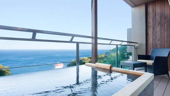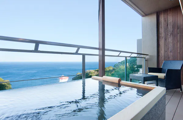 電車で東京から約1時間、名古屋から約2時間と好アクセスの熱海。その高台に立つ「ATAMI せかいえ」は、大海原を見晴らす絶景の宿です。全室に、長寿の湯として親しまれてきた伊豆山温泉を掛け流しで楽しめる露天風呂を完備。潮風を感じながら、非日常感溢れる湯浴みを体験できるでしょう。