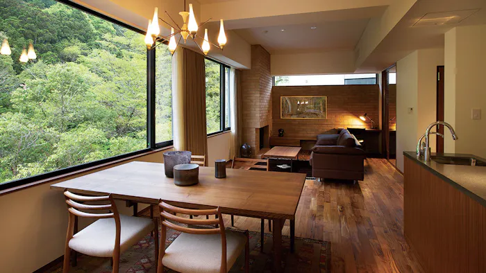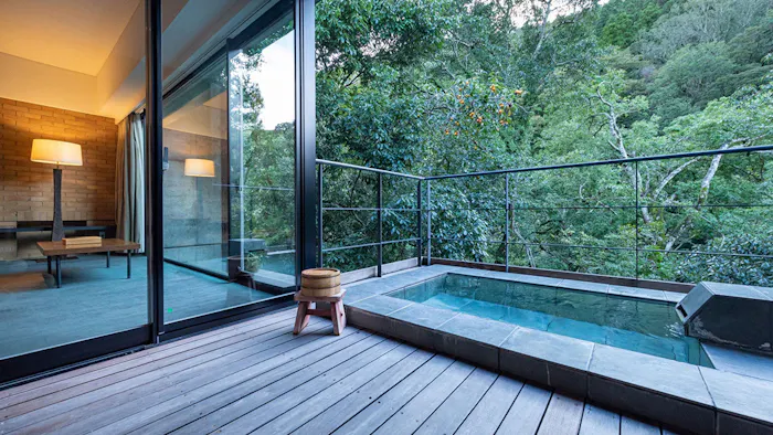 全16室の中で、「ザ・スイート/禁煙」は、特別な日に似合うお部屋。ミニキッチン付のダイニングや、渓流を望むテラスに温泉露天風呂が備わります。緑に抱かれるような環境で、日ごろのストレスを手放し、ありのままのご自身に還るバスタイムを楽しんで。