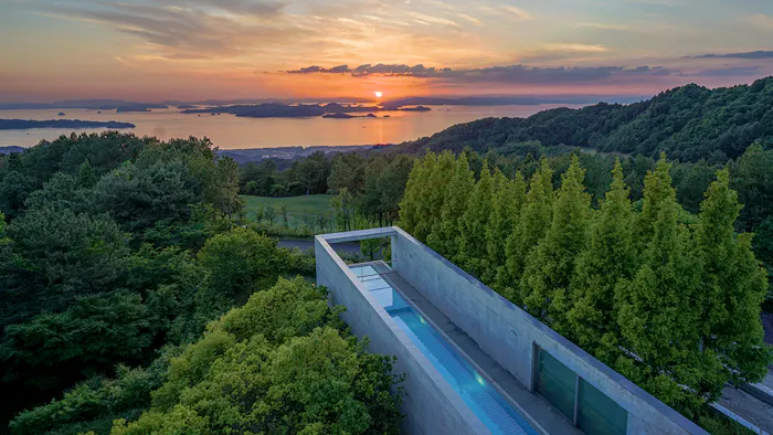 瀬戸内の多島美を一望するオールスイートの宿「瀬戸内リトリート 青凪 by 温故知新」は、建築家・安藤忠雄氏設計の全7室のリゾートホテルです。かつて美術館として使用されていた建物はモダンなコンクリート打ちっぱなしスタイル。