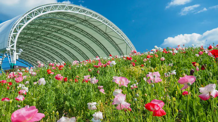 四季折々の植物を楽しめ、南国ムード溢れる大温室も備わる「兵庫県立フラワーセンター」。春になると多品種のチューリップを満喫できるほか、サルビア、マリーゴールド、ビオラなど季節ごとに咲き誇る草花の数は年間60万株と圧巻です。