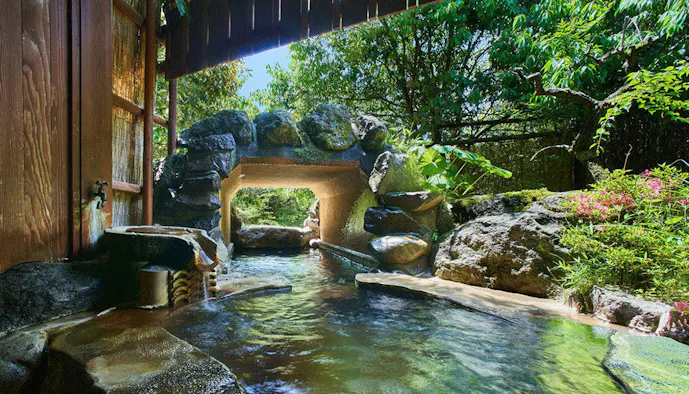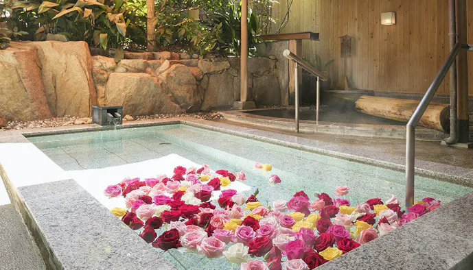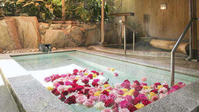 宿の大きな魅力のひとつでもあるのが、趣の異なる3か所の湯処。すべて合わせると15種類ものお風呂があるため、宿にいながら湯巡りを満喫できます。地下1階「花すみか」の婦人風呂には、人気の「はな露天」が。浮かべる花は時間ごとに変わるので、両方とも試してみたいですね(バラ15:00~24:00、ラン5:00~10:00)。