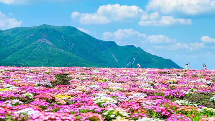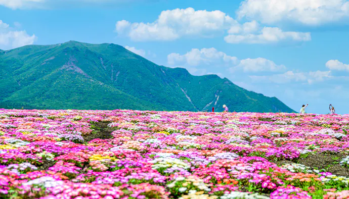 大分県・阿蘇国立公園内の久住高原に位置する「くじゅう花公園」。日本百名山として知られるくじゅう連山を背景にする、西日本最大級の花畑スポットです。園内にはチューリップやポピーなど定番の花に加えて、温室も完備されているため雨の日のお出かけにもぴったり。