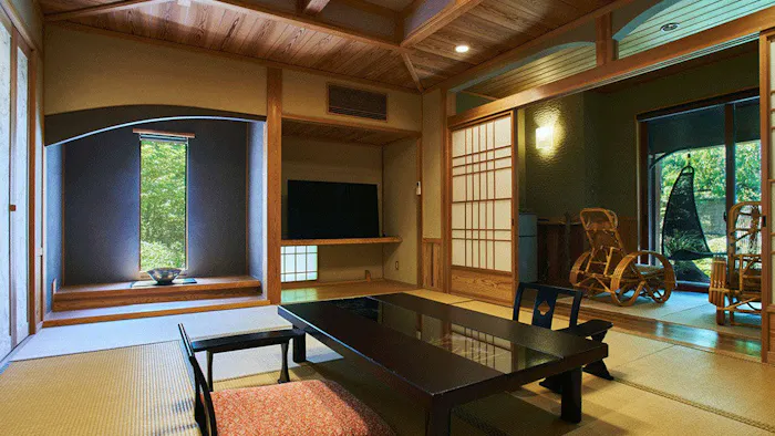 茶室が付いた客室「なでしこ」は、“侘び”と“寂び”をテーマにした特別室。10畳の和室と7畳のベッドルームがある広々とした造りで、室内には心安らぐ木の香りが漂います。珍しいデザインの露天風呂では、庭の緑を愛でながら至福のひとときが過ごせることでしょう。