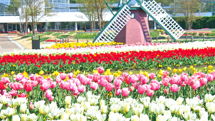 四季折々の植物を楽しめ、南国ムード溢れる大温室も備わる「兵庫県立フラワーセンター」。春になると多品種のチューリップを満喫できるほか、サルビア、マリーゴールド、ビオラなど季節ごとに咲き誇る草花の数は年間60万株と圧巻です。