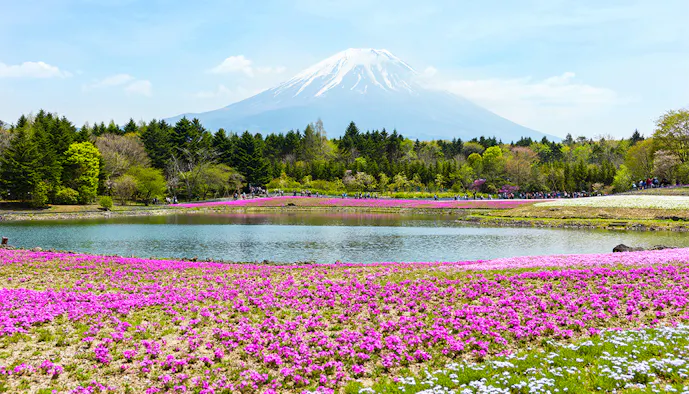 「富士本栖湖リゾート」は、本栖湖から車で5分ほどの場所にある人気の観光スポット。毎年春に開催される「富士芝桜まつり」が有名で、あたり一面を埋め尽くす鮮やかなシバザクラと、雄大な富士山の景色を一度に満喫できるのは、ここならではと言えるでしょう。