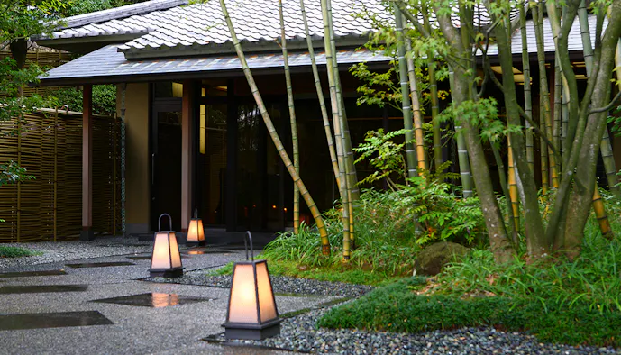 有馬温泉駅から歩くこと約3分。賑わう温泉街の喧騒から一線を画す「有馬温泉 欽山」は、1929年創業の老舗温泉旅館です。エリア屈指の美食の宿としても知られており、旬の食材を用いた京風創作懐石料理が自慢。大浴場には、有馬温泉の名物ともいえる茶褐色の金泉を湛えています。