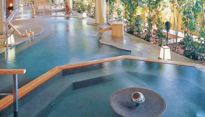 ナトリウム・カルシウム-硫酸塩・炭酸水素塩・塩化物泉(低張性中性高温泉)などの泉質を持つ源泉の上に浴槽を設け、湯船の底板から湧き出す珍しい“源泉湧き流しの湯”を満喫することができます。
