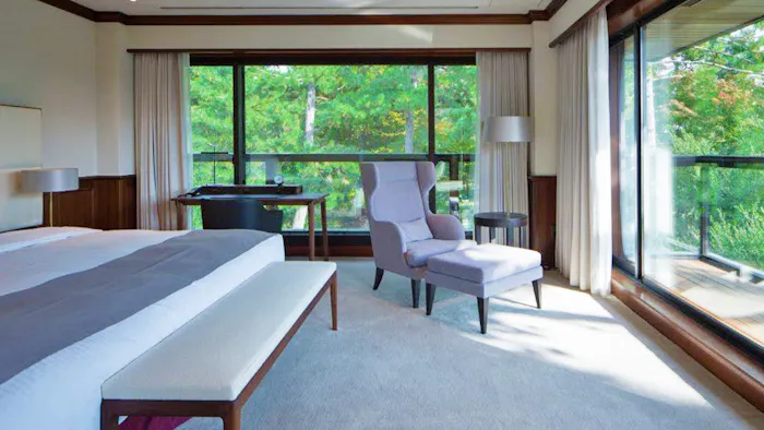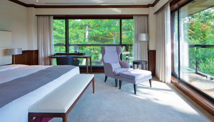 わずか13室の客室には「スイート」「ファミリースイート」「デラックス」「シングル」の4タイプをご用意。どの客室も上質でモダンな空間です。レストラン「ル・ボワ」は、札幌にあるフレンチの名店「モリエール」のオーナーシェフ・中道博氏と、中道氏からの信頼が厚い今智行シェフの2人がプロデュースを担当しています。北海道と奈良の厳選素材が織り成すハーモニーをゆっくりと味わいましょう。
