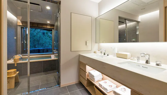 全41室ある客室の中でも注目したいのが、2022年11月にリニューアルした「登竜館 露天風呂付き客室」の3室。いずれも源泉掛け流しの露天風呂を完備しています。「キングサイズベッドルーム」「ツインルーム」の他、本格的なロウリュウサウナが備わる「プライベートサウナ付き」のタイプもあり、スタイルに合わせて選ぶことができます。季節ごとに変わる自然や、澄み切った空気に囲まれた環境で、何もしないひとときを味わいに、ぜひ訪れてみませんか。