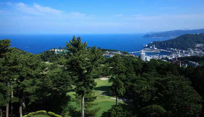 標高300メートルの小高い丘に位置する「熱海倶楽部迎賓館」。熱海駅から車でわずか10分ながら、眼下に広がる相模湾と敷地内の緑のコントラストはまさに絶景。熱海ゴルフ倶楽部の敷地内で掘削した源泉掛け流しの大浴場では、 美肌効果に優れたにごり湯と景色が自慢です。全室70平米以上、源泉掛け流しの半露天風呂を完備した客室からもまた、大きな窓から遮るもののない一面の景色を望みます。
