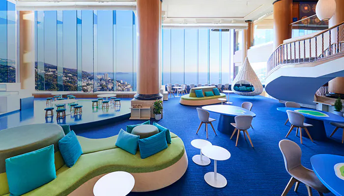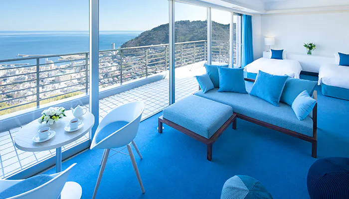 熱海の山の上に佇むスタイリッシュなリゾート「リゾナーレ熱海」。豊かな“海”と年間を通じて打ち上がる“花火”をコンセプトとし、館内は青と白を基調とした爽やかなインテリアでまとめられています。