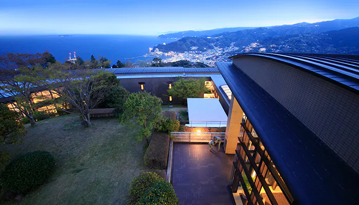 JR熱海駅から送迎バスで約3分。急な坂道を上り切ると、山王山の高台に立つ「横山大観ゆかりの宿 熱海 大観荘」に到着します。日本画の巨匠・横山大観がよく訪れていたことからその名前をいただき、現在の宿名になったと言われています。客室は全37室。横山大観も宿泊した「大観の間」をはじめ、それぞれ趣のある準京風の数寄屋造りで、相模湾や庭園の展望が自慢です。