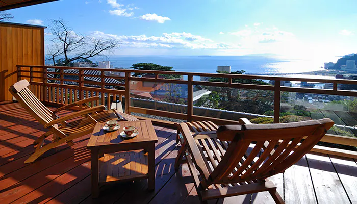 熱海駅から車で5分。高台に位置する「リラックス リゾート ホテル」は、相模湾の先に初島、伊豆大島までも望む、全16室のリゾートホテルです。