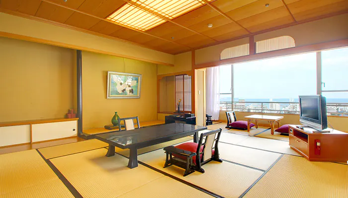 全室オーシャンビューの客室は、昼間は大きな窓からたっぷりと陽の光が注ぎ、まるで海にいるような気分を味わえます。客室からの見晴らしは、眼下に広がる熱海の街の景色や相模湾に上る日の出、そして花火まで。時間の移ろいとともに表情を変えていく熱海の景色をひとりじめできる、山の上の特等席と言っても過言ではないでしょう。ここでは絶景とともに贅沢な時間を過ごせます。