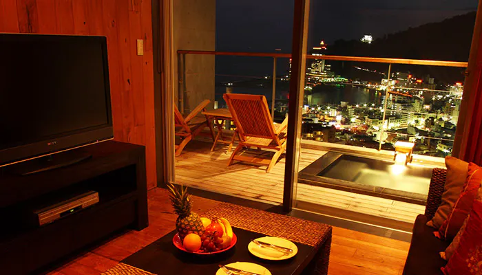 本館は、バリ直輸入の天蓋ベッドを備えたリゾートスタイルルームと、建築家ル・コルビジェデザインのソファを配したモダンスタイルルームの2種類。別館のヴィラは、天然温泉かけ流しの露天風呂付客室です。本館・別館全ての客室から眼下に熱海の街並みと相模湾を望み、花火大会の日には全室から視界を遮るもののない環境で花火を楽しめます。客室のテラスから、露天風呂から、自分たちだけの花火に酔いしれましょう。