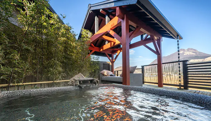 湯布院にある3室のみのヴィラ「Yufuin Luxury Villa -zakuro-」。ここはただひたすら、のんびり、ゆったりした休息を求める夫婦におすすめしたい癒しの宿で、雄大な由布岳ビューが目の前に広がる田園の中にひっそり佇んでいます。正面にJR九州の豪華列車「ななつ星」が走ることもあり、鉄道ファンならずともワクワクさせてくれます。ヴィラは、土蔵をモチーフとした温かみのある「離れ -dadaroma-」と、石をイメージしたモダンテイストの「離れ -14R-」、約4メートルの広々とした源泉掛け流しの専用風呂が備わる「蘭鋳-Ranchu-」。