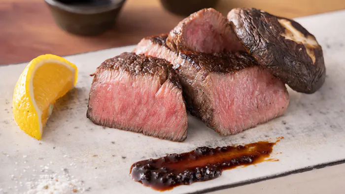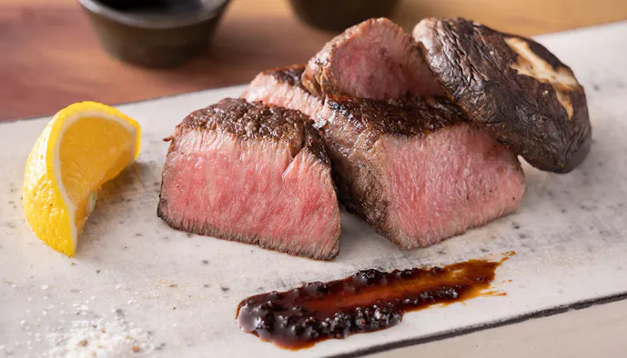 夕食は、隣接のダイニング「kurogane」のゲスト専用個室で。肉料理に定評がある「kurogane」が手がけるだけあって、メイン食材は大分県が誇るブランド牛の豊後牛。それも希少なA5ランクのシャトーブリアンです。由布岳の景色に包まれて緩やかに過ぎる時間を楽しみましょう。