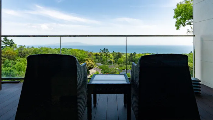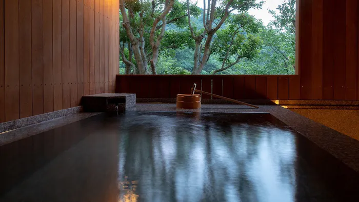 伊豆熱川の緑豊かな里山にひっそりと佇む「奥熱川 庭園と竹の湯宿 奈良偲の里 玉翠」の姉妹館「全室源泉掛流し露天風呂付 大室の杜 玉翠」。伊豆高原の高台から海を望む、全9室、4タイプの客室は、全室に相模湾を一望するデッキテラスと温泉露天風呂を備えています。広々とした湯船には、伊豆高原の源泉掛け流しの湯が並々と注がれます。