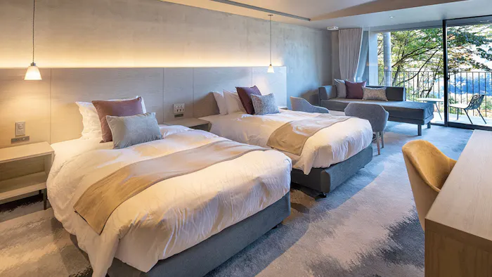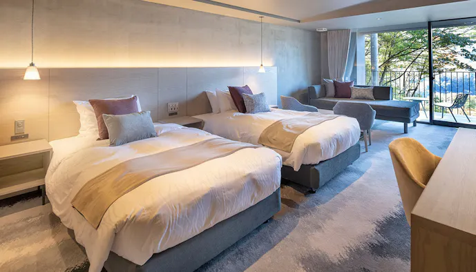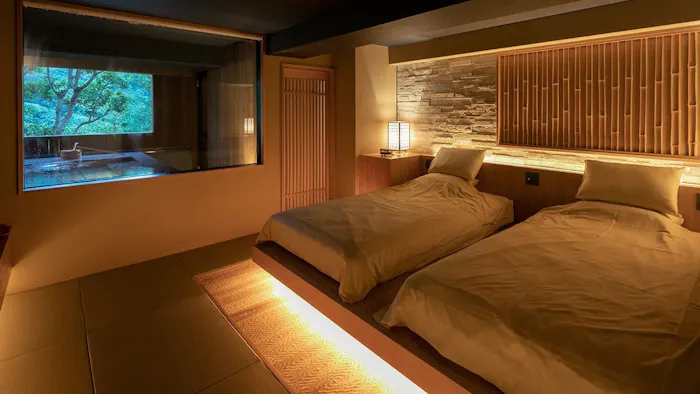箱根外輪山明星ケ岳中腹に位置する、大人限定のスモールラグジュアリーの宿「HAKONE NICA」。客室は全8室、3タイプで、全室に源泉掛け流しの半露天風呂を完備しています。チェックインからチェックアウトまでの滞在中の飲み物は「フリーフロー」となっていて、ワインやウイスキー、日本酒などの数十種類のお酒が、滞在中のフリーフローで楽しめるのは、箱根初で唯一。