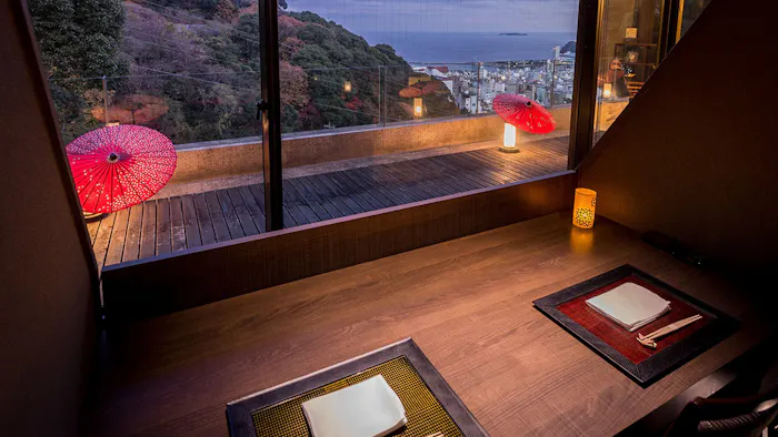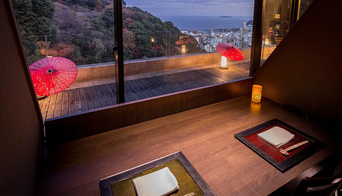 夕食は、専用のダイニングでいただきます。2名ごとに仕切りの付いたカウンターのほか、人数によってはプライベート感のある個室も用意されています。夜景を望むダイニングで伊豆自慢の食材を用いた創作会席料理を味わいましょう。季節の食材を楽しみながら、相模湾の絶景や温泉で心身共に癒される。頑張っている自分たちへのご褒美時間はいかがですか?