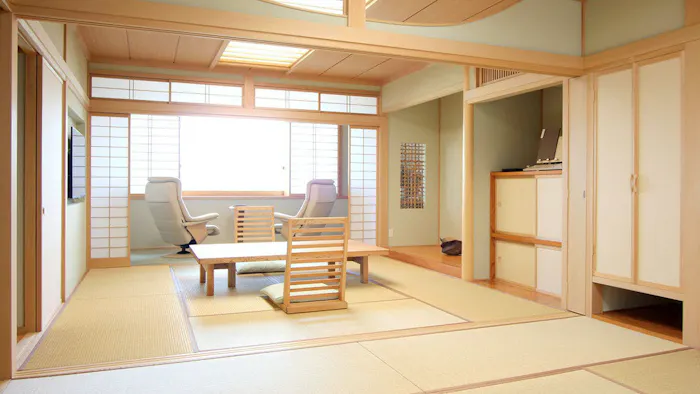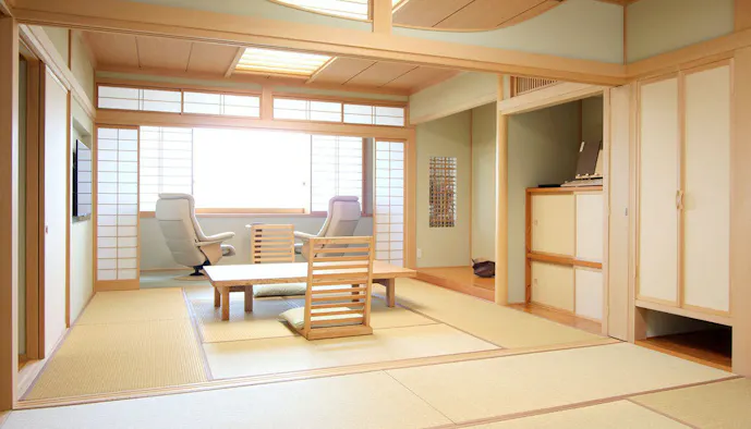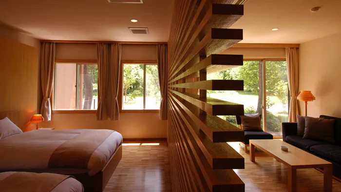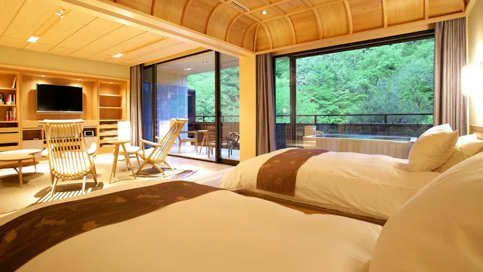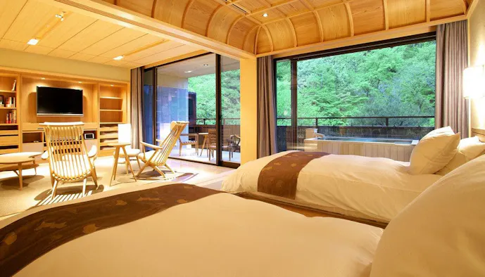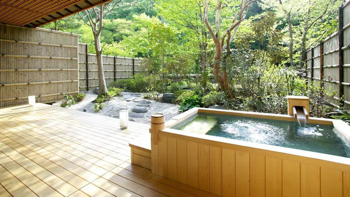 全室スイートルームの客室は「ジャパニーズ・スイート」3室と、専用の日本庭園を備えた和室5室で構成されています。「ジャパニーズ・スイート」の半露天テラス風呂も、庭園付和室の露天風呂も、無色透明の白銀の湯。隣接する本館「福一」では、伊香保温泉のもうひとつの名湯「黄金の湯」を堪能することができます。