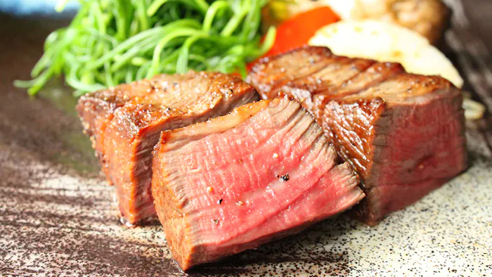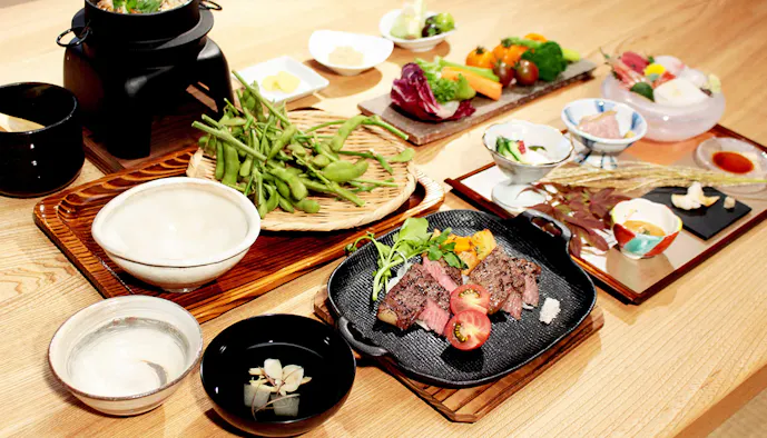 選べるメイン料理は、米沢牛ステーキやすき焼き、しゃぶしゃぶから。
