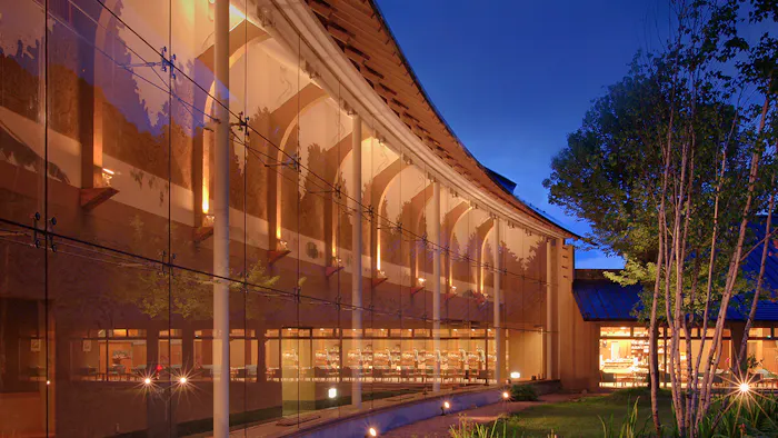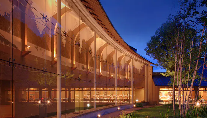 東京から上越新幹線で約1時間15分、バスで約30分の場所にある「別邸 仙寿庵」は、群馬県の名峰、谷川岳を望む山間に立つ温泉宿です。宿に足を踏み入れてまず目を引かれるのは、ガラス張り曲面廊下をはじめとする現代建築と、手漉き特殊和紙や漆喰、京土壁などの伝統技術が融合した佇まい。山間の景観とも調和する和洋折衷の内装は、まるで美術館にやって来たような心躍る滞在を叶えます。