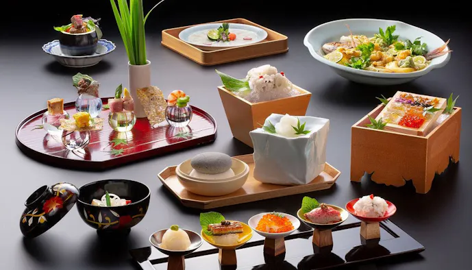 「貴賓館 4階貴賓室『山(やま)』」をはじめとする3室ある貴賓室に滞在するゲストは、客室に隣接する専用部屋で食事をいただけます。海の幸・山の幸に恵まれた伊豆産を中心とした、選りすぐりの素材の持ち味を最大限引き出した日本料理を、大切な方とじっくり噛みしめながら味わう“口福”に浸りたいものですね。