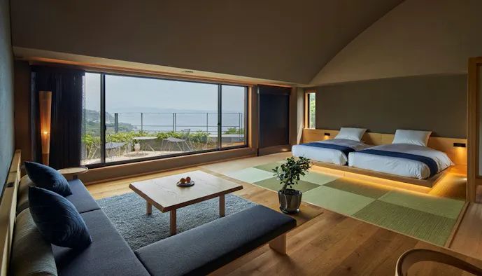 「ビュースイート4階/和洋室」は、すっきりとした和モダンの設えが、旅慣れた大人を寛がせてくれるでしょう。大きなバスタブに身を浮かべながら、相模湾の絶景を見晴らすバスタイムは旅先だからこそのご褒美。また「Le Furo(ルフロ)」で、石風呂とミネラルミスト温浴をかけ合わせた湯を浴びるという新しい温浴習慣を体験し、新感覚の湯治を満喫するのもいいですね。