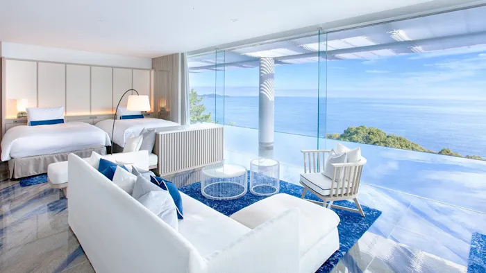 東京や名古屋方面から気軽に行けるリゾート地、静岡県熱海。「ATAMI海峯楼」は、著名建築家の隈研吾氏が水とガラスをテーマに設計した、スモールラグジュアリーな大人限定の宿です。館内には、世界的に評価される画家・千住博氏の作品などが配され、アートを肌で体感できるとゲストから高く評価されています。