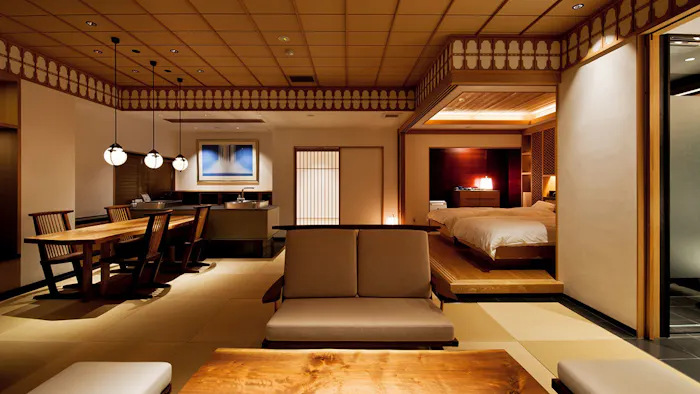 施設内には、地下1,500メートルから汲み上げた源泉掛け流しの湯を楽しめる、ウッドデッキ併設の露天風呂も備わります。湯上りに潮風を感じながら、夕日が沈みゆく瀬戸内海の景色を堪能するのも、この宿ならではの特別な体験。宿泊者限定の夕食は、数寄屋造りの趣あるダイナー「万里荘」で。新鮮な魚介類や季節の食材を使った和食コースと、日本酒またはリッジワインとのマリアージュをぜひ試してみて。